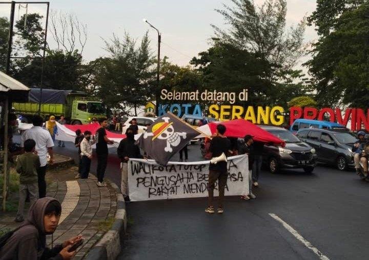Serang - Puluhan mahasiswa dari berbagai elemen yang tergabung dalam Aliansi Perjuangan Mahasiswa dan Rakyat menggelar aksi demonstrasi di Kota Serang. Senin, (25/8/25). Massa melakukan long march dari lampu merah Ciceri menuju Kantor Wali Kota Serang sambil mengibarkan bendera merah putih raksasa sebagai simbol protes terhadap keberlanjutan Mega Proyek Sawah Luhur yang dinilai ilegal, cacat izin, dan sarat maladministrasi.